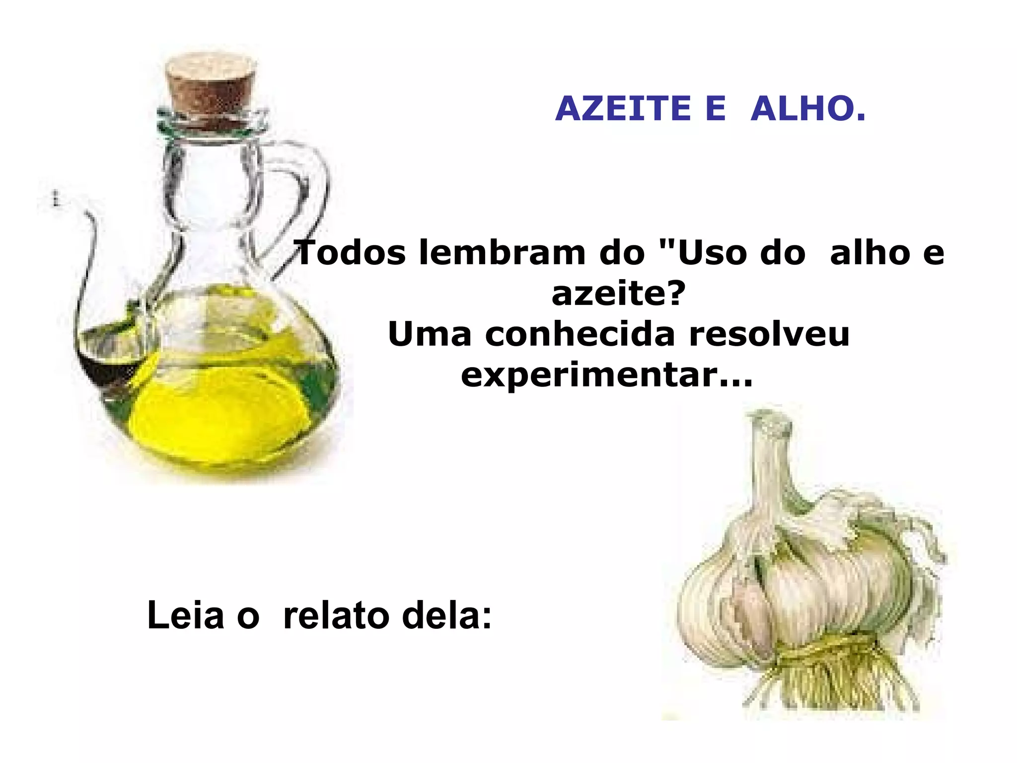 O documento relata os benefícios do consumo diário de alho e azeite de oliva, incluindo emagrecimento, redução da pressão arterial e dos níveis de colesterol, melhoria da circulação sanguínea e fortalecimento do coração. Uma pessoa que começou a usar alho e azeite diariamente por dez meses teve uma melhora significativa em sua saúde, surpreendendo o médico cardiologista. O documento recomenda o consumo de 1 dente de alho por 20 quilos de peso, misturado com 1