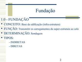 O documento descreve diferentes tipos de fundações utilizadas na construção civil, incluindo suas características, processos de execução e aplicabilidade. É apresentada a diferença entre fundações diretas e indiretas, bem como detalhes sobre alicerces, sapatas, blocos e radier, ilustrando seus processos construtivos e quando cada um é mais apropriado.