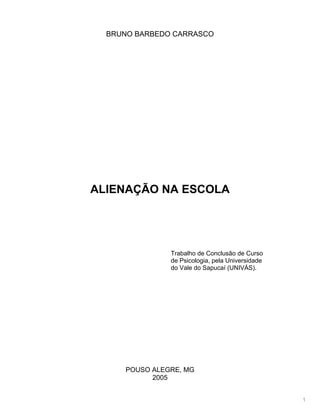 O documento apresenta um resumo de um trabalho de conclusão de curso de psicologia sobre alienação na escola. O trabalho critica o sistema pedagógico tradicional onde professores e alunos são tratados como meros reprodutores da ideologia da classe dominante. Isso leva ao distanciamento do indivíduo em relação a si mesmo e aos outros, movendo-se para a reprodução de comportamentos limitadores. O trabalho propõe uma educação mais consciente e participativa, com uma relação humana, dialética e libertária entre todos os envolvidos no
