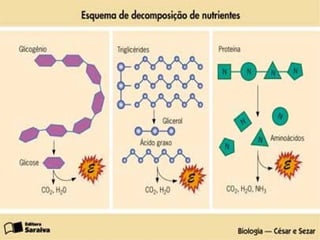1) O documento discute os nutrientes essenciais para o corpo humano e o sistema digestivo. 2) São listados os principais nutrientes como proteínas, carboidratos, gorduras, vitaminas e minerais, e explica as funções de cada um no corpo. 3) Também descreve as etapas da digestão, incluindo a secreção e ação de enzimas nas glândulas salivares, estômago, fígado, pâncreas e intestino.