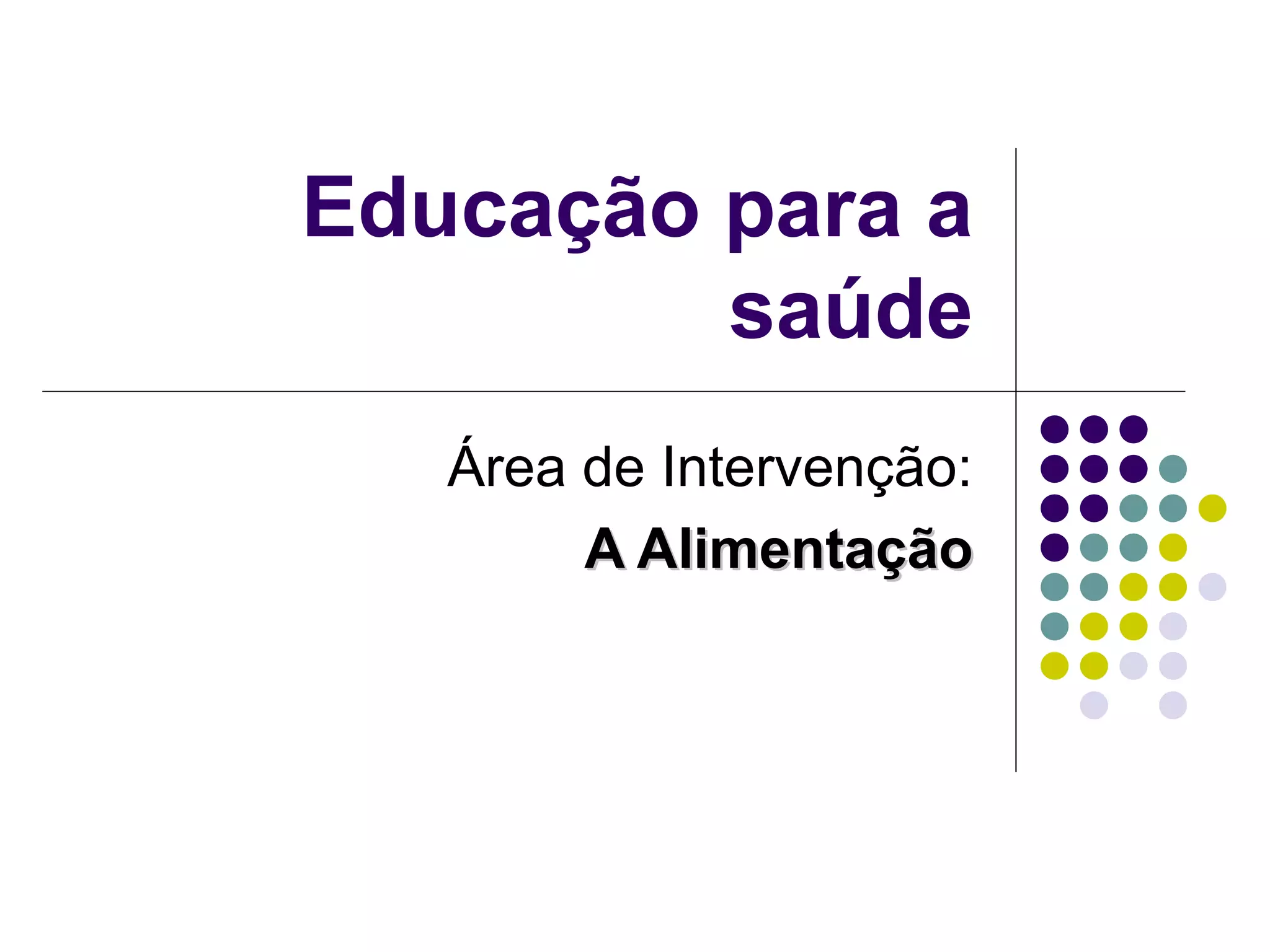 O documento discute a importância da alimentação para a saúde, destacando que ela fornece energia, nutrientes e contribui para a prevenção de doenças. Ele também apresenta princípios para uma alimentação saudável como variar os alimentos, manter o equilíbrio energético e beber água, e introduz a Roda dos Alimentos que divide os alimentos em sete grupos.