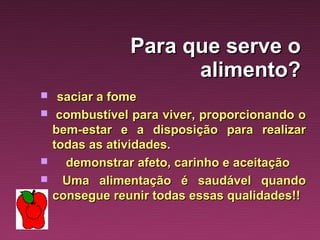 O documento discute os nutrientes essenciais para uma alimentação saudável, incluindo proteínas, carboidratos, gorduras, água, vitaminas e minerais. Ele explica que uma dieta equilibrada deve incluir uma variedade de alimentos para fornecer esses nutrientes e manter a saúde. Uma alimentação saudável significa comer de forma variada e moderada, com foco em frutas, vegetais e exercícios físicos.