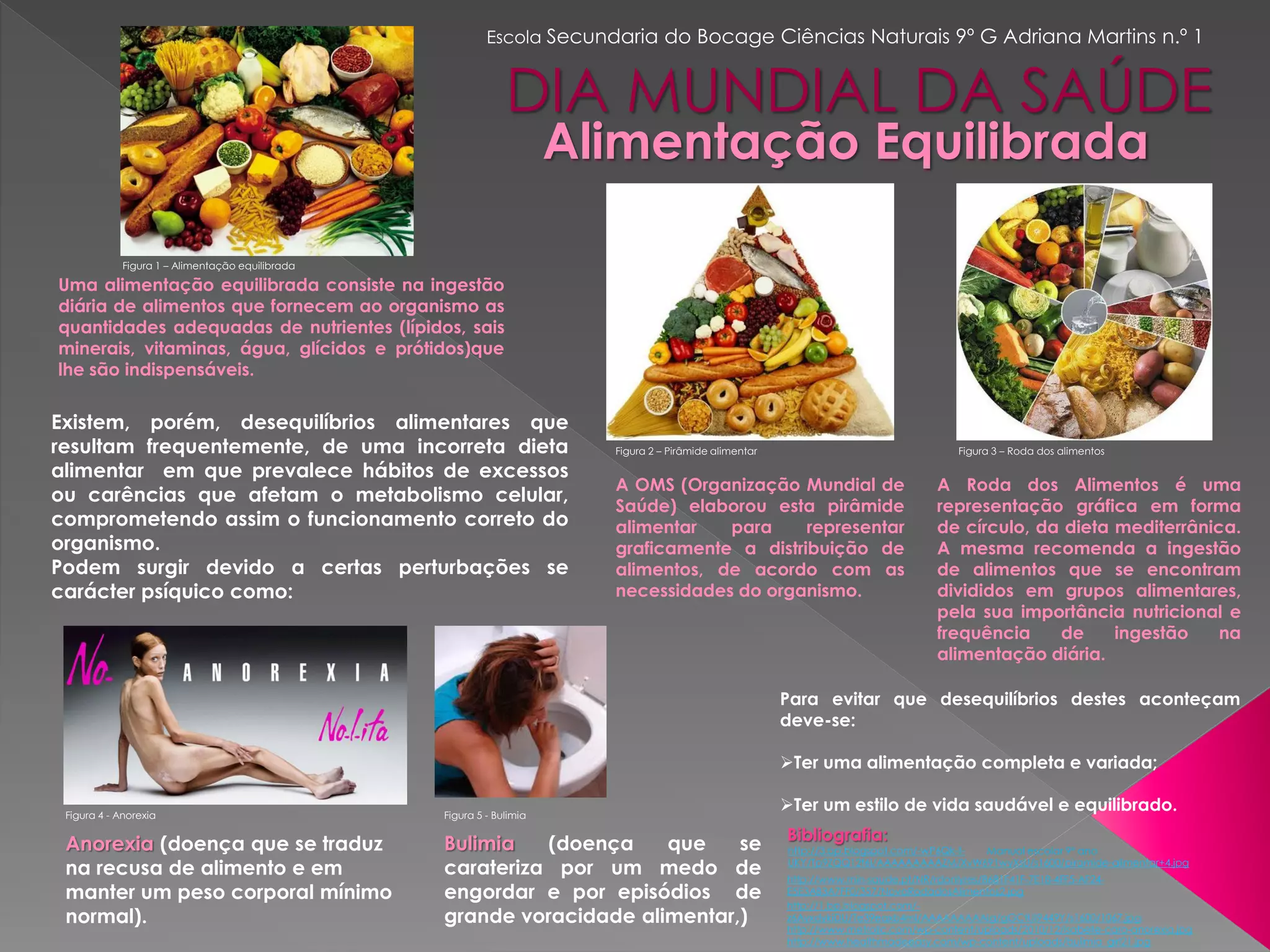 O documento discute uma alimentação equilibrada e os problemas que podem surgir de desequilíbrios alimentares, como anorexia e bulimia. Ele explica que uma dieta equilibrada fornece nutrientes necessários e apresenta a pirâmide e roda alimentares como guias. Aconselha ter uma alimentação variada e estilo de vida saudável para evitar desequilíbrios.