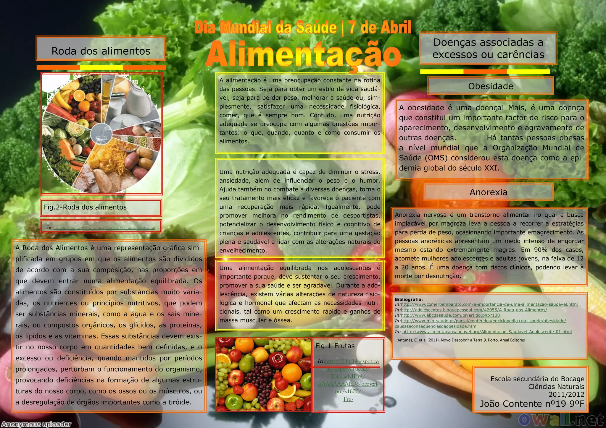 O documento discute uma alimentação equilibrada e suas implicações para a saúde, mencionando doenças como obesidade e anorexia associadas a desequilíbrios alimentares. Apresenta também a Roda dos Alimentos, que classifica os grupos de alimentos de acordo com sua composição nutricional.