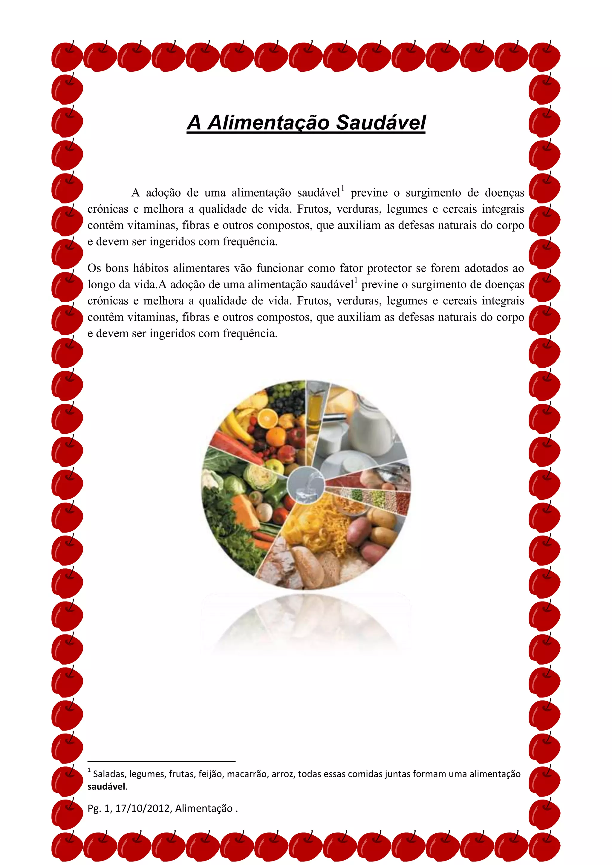 Uma alimentação saudável com frutas, verduras, legumes e cereais integrais previne doenças crônicas e melhora a qualidade de vida, pois esses alimentos contêm vitaminas, fibras e compostos que auxiliam as defesas do corpo. Hábitos alimentares saudáveis ao longo da vida funcionam como fator protetor.