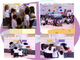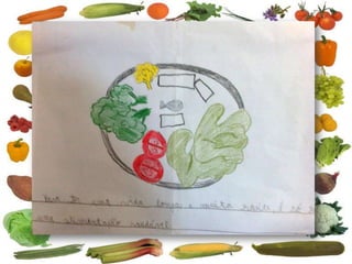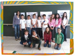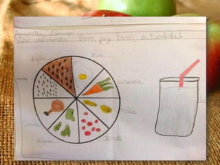 O documento lista atividades educacionais sobre alimentação saudável, incluindo uma peça de teatro, leitura sobre alimentos naturais, atividades com rótulos de alimentos, pirâmides alimentares e de atividades físicas, além de apresentações e cartazes sobre pesquisas realizadas por alunos do quinto ano.