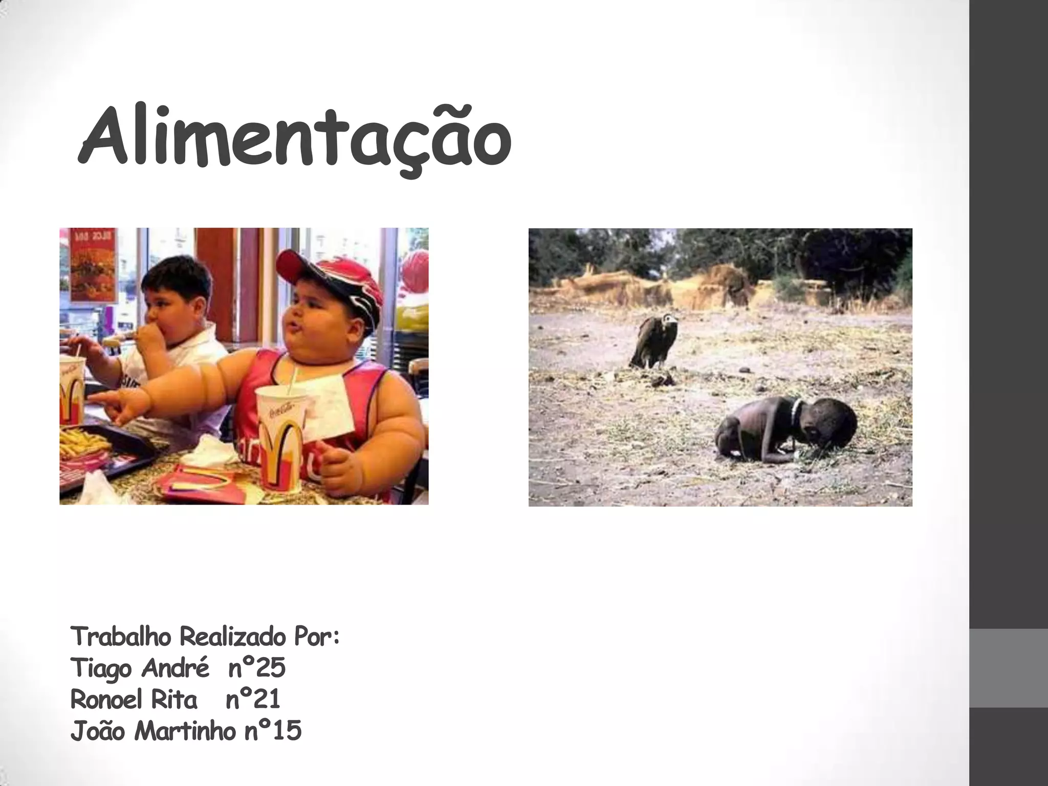 O documento discute como a alimentação varia entre países desenvolvidos, em desenvolvimento e Portugal. Nos países desenvolvidos, as pessoas tem pouco tempo para cozinhar e dependem de alimentos pré-cozinhados, levando a problemas de saúde. Nos países em desenvolvimento, a maioria sofre de subnutrição devido a conflitos e desastres naturais. Em Portugal, a alimentação varia por região, apesar da rica gastronomia.