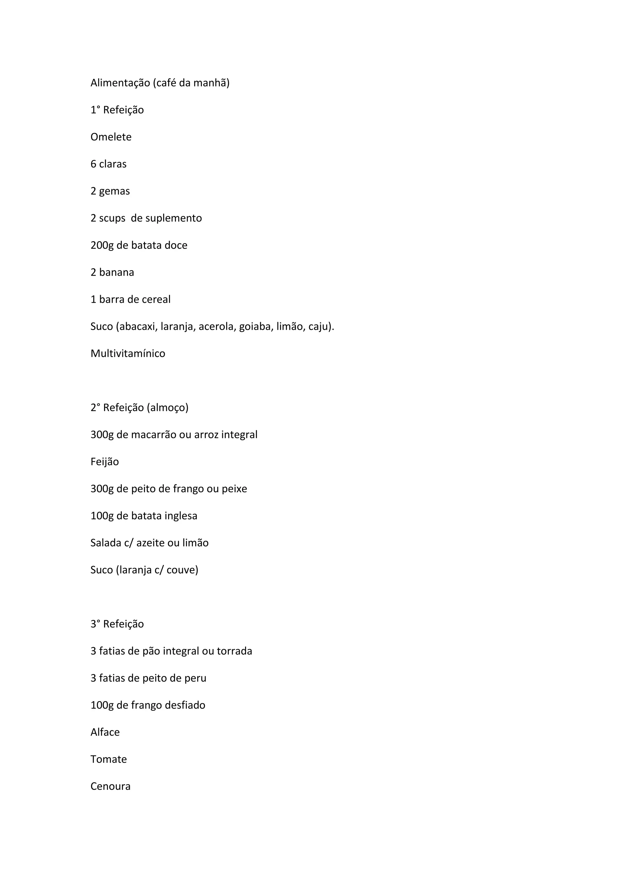O documento descreve a dieta de alguém ao longo do dia, incluindo 4 refeições principais e suplementos. A primeira refeição consiste em omelete, frutas, cereal e suco. A segunda refeição é macarrão ou arroz, feijão, frango ou peixe e salada. A terceira refeição é pão, peru, alface e tomate. Antes e depois do treino há suplementos e refeições leves. A quarta refeição repete o omelete da manhã.