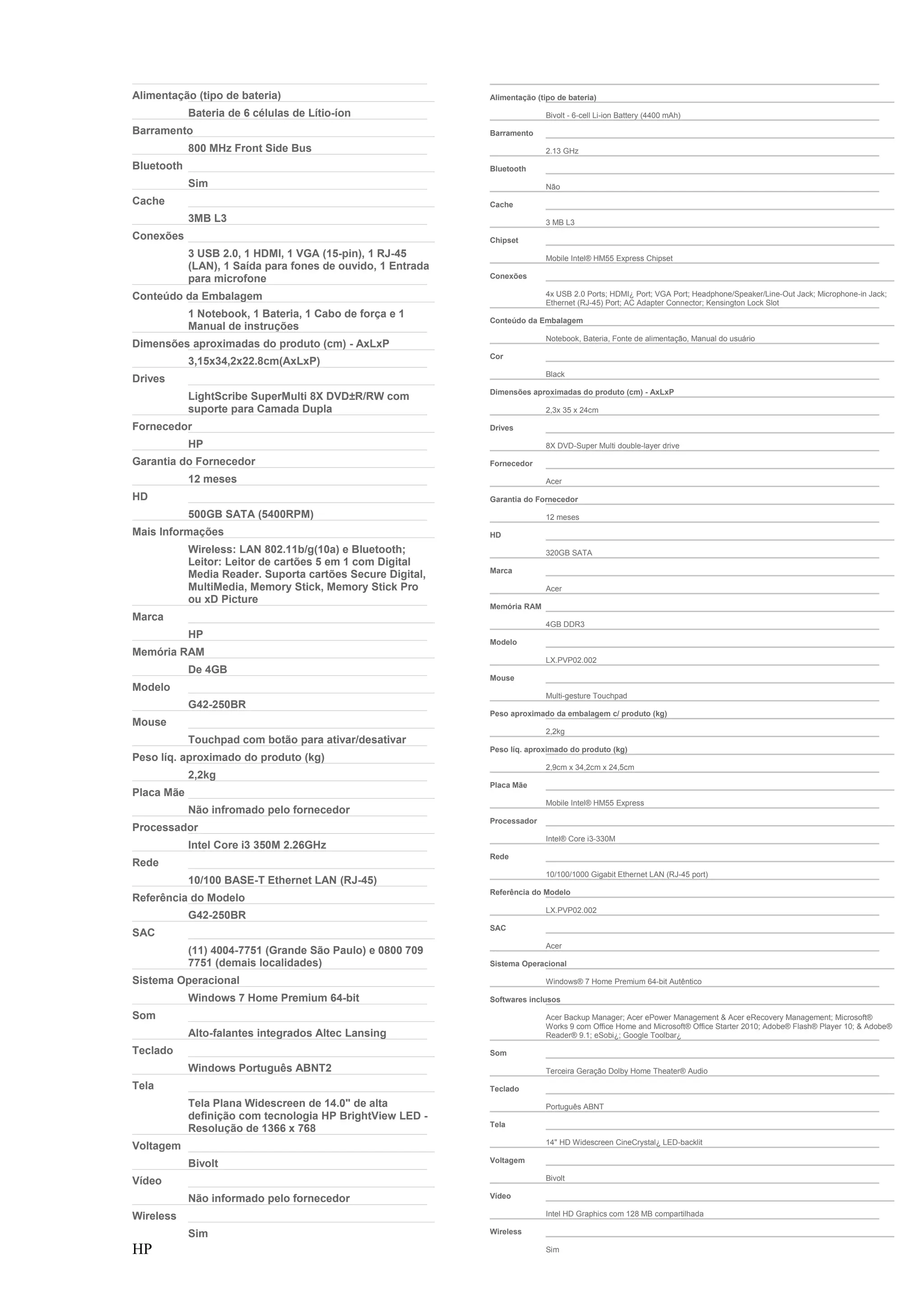 Este documento fornece especificações técnicas detalhadas de um notebook da marca HP, incluindo: processador Intel Core i3, tela de 14 polegadas, memória RAM de 4GB, HD de 500GB e bateria de lítio de 6 células.