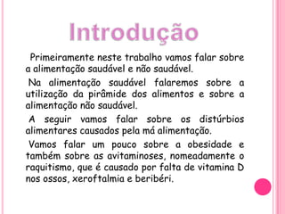 Este documento discute a importância de uma alimentação saudável versus não saudável. Ele explica a pirâmide alimentar e como ela promove uma dieta equilibrada, e também descreve distúrbios como obesidade, raquitismo, xeroftalmia e beribéri que podem resultar de uma má alimentação. Ele conclui enfatizando a necessidade de incluir proteínas e vitaminas na dieta para prevenir doenças.