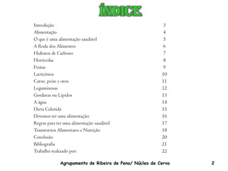 Este documento discute a importância de uma alimentação saudável e equilibrada. Ele explica a roda dos alimentos e seus principais grupos, incluindo hidratos de carbono, hortícolas, frutas, lacticínios, carnes, peixes, ovos, leguminosas, gorduras e água. Também fornece dicas sobre como ter uma dieta colorida e balanceada e regras para uma alimentação saudável.