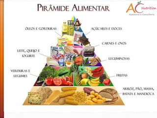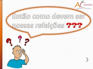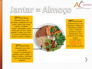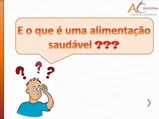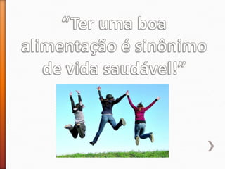 O documento discute a importância de uma alimentação saudável preparada com cuidados de higiene e que fornece todos os nutrientes necessários em quantidades adequadas. Ele também lista dicas para uma boa alimentação como tomar café da manhã, comer de 3 em 3 horas, incluir frutas, verduras e legumes na dieta e beber bastante água.