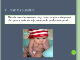 Metade dos adultos e um terço das crianças portuguesas têm peso a mais. Isto resulta de um desequilíbrio entre a energia ingerida e gasta. Ter excesso de peso está ligado ao desenvolvimento de doenças. Uma alimentação saudável e atividade física regular ajudam no controle do peso e prevenção da obesidade.