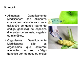 O documento discute alimentos geneticamente modificados, destacando que são criados em laboratórios com genes de diferentes espécies. Aponta pontos positivos como aumento da produção e resistência, mas também negativos como riscos à saúde e ao meio ambiente. Discorre sobre a segurança dos produtos e a necessidade de rotulagem adequada. Por fim, apresenta a visão do Greenpeace, contrária aos transgênicos.