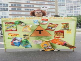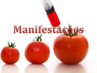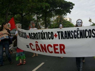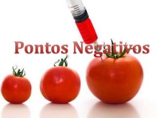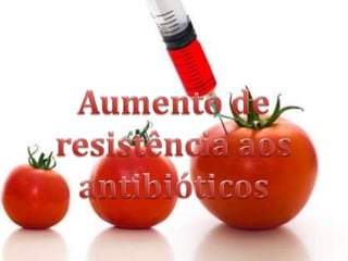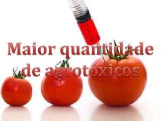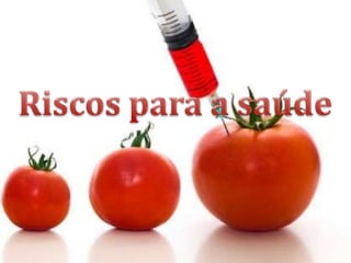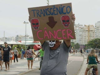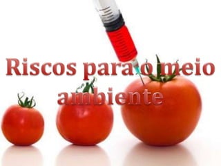 O documento discute os riscos potenciais dos organismos geneticamente modificados, incluindo o aumento de alergias, o desenvolvimento de "super-pragas" resistentes a agrotóxicos, e os prejuízos ambientais como maior poluição dos solos e rios.