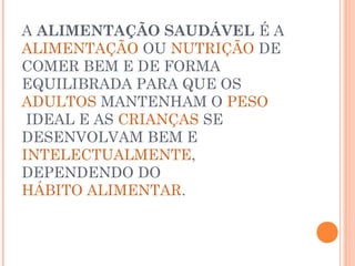 O documento discute a importância de se manter hábitos saudáveis de alimentação e estilo de vida para promover a saúde física e mental. Ele fornece dez passos para uma alimentação saudável, lista os principais grupos de alimentos e nutrientes necessários, e dez hábitos gerais para uma vida saudável, como praticar exercícios, dormir bem e evitar cigarros e álcool.