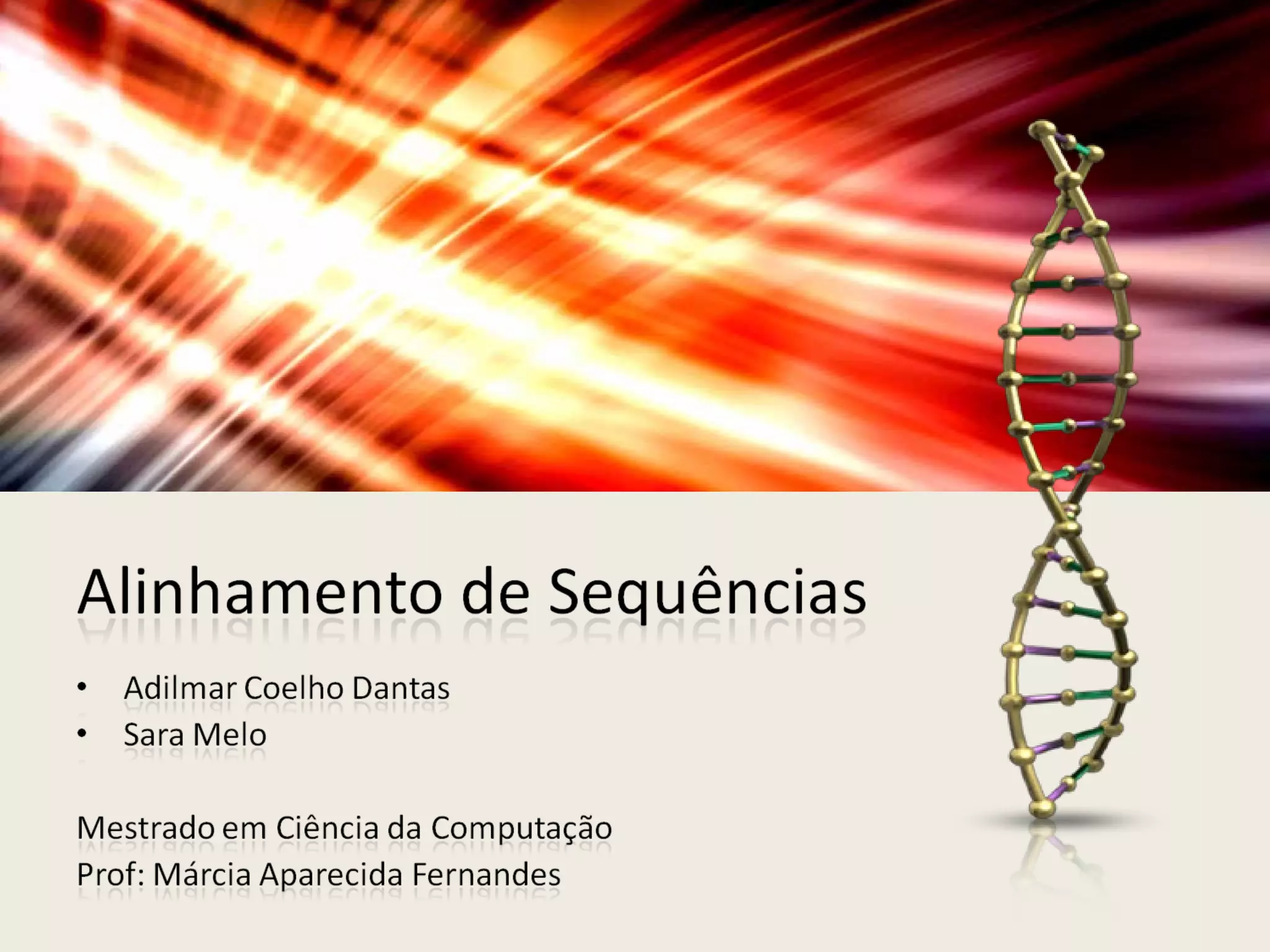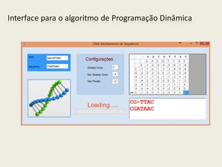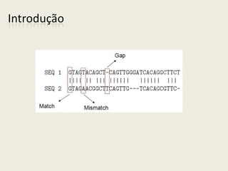 O documento discute alinhamento de sequências e como comparar duas sequências de DNA ou proteínas. Explica que alinhar sequências permite estudar evolução molecular, detectar doenças e mais. Descreve como calcular o score de um alinhamento e apresenta algoritmos recursivo e de programação dinâmica para encontrar o alinhamento ótimo.