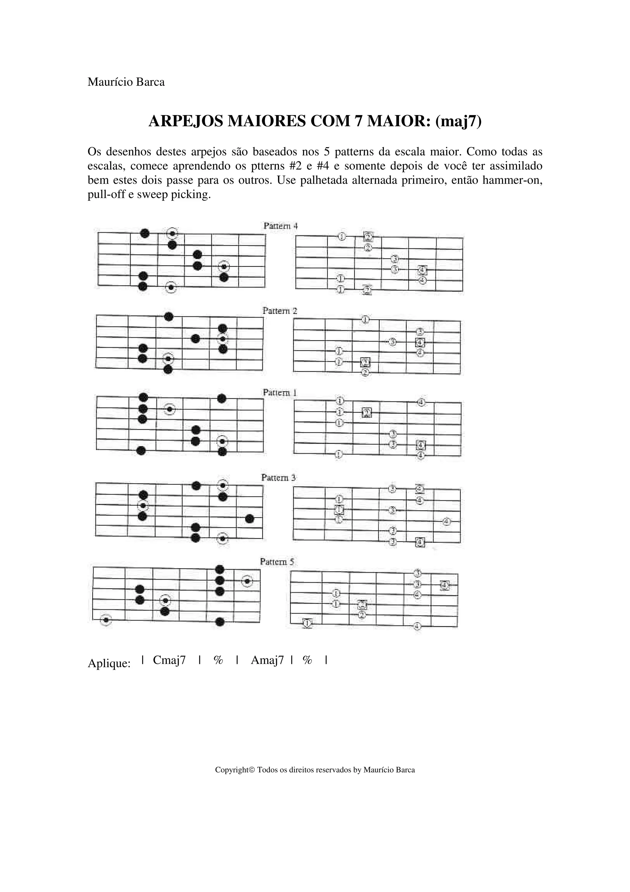O documento fornece instruções sobre como tocar arpejos maiores com 7 maior, menores com 7 menor, dominantes com 7 e menores com 7 menor e quinta bemol em diferentes acordes, incluindo C, A e seus respectivos padrões. O autor recomenda aprender os padrões 2 e 4 primeiro e aplicar diferentes técnicas como palhetada alternada, hammer-on e pull-off.