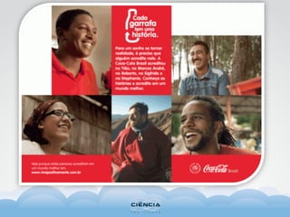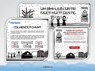 O documento discute como as empresas estão adotando causas sociais e ambientais em suas estratégias de marketing. Algumas empresas exemplificadas incluem a Panasonic, que apoia projetos de preservação da arara-azul, a Natura, que tem sustentabilidade integrada em seus valores desde o início, e a PepsiCo, que constrói cisternas para armazenamento de água da chuva no semiárido brasileiro.