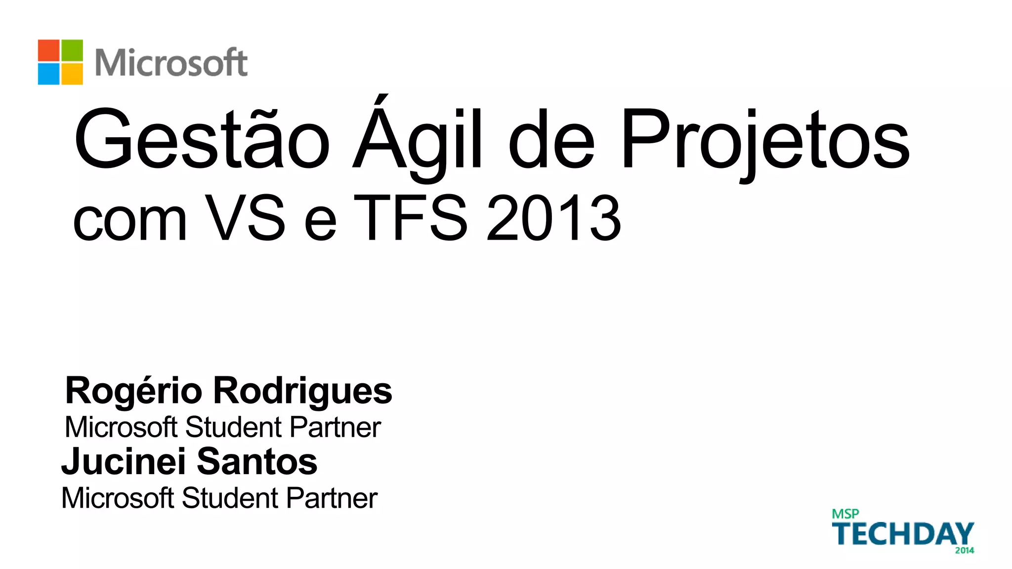 O documento discute a gestão ágil de projetos no Visual Studio e TFS 2013, apresentando os papéis no framework Scrum, os tipos de work items, e relatórios como release burndown, sprint burndown e velocity. Ele também demonstra recursos como backlog, burndown e velocity no VS e TFS e encerra convidando para perguntas.