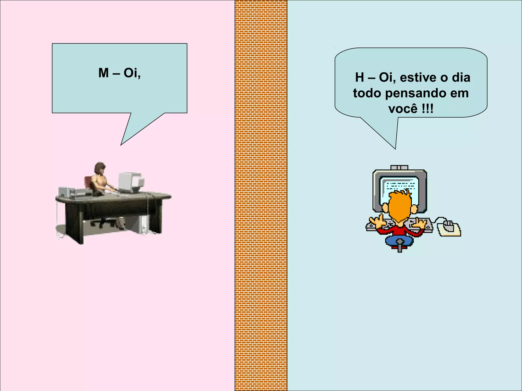H e M trocam mensagens sugerindo um envolvimento extraconjugal. Apesar de ambos afirmarem estar apaixonados, reconhecem a dificuldade por já serem casados. Planejam um encontro às 6h para ficarem juntos.