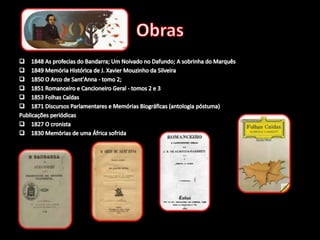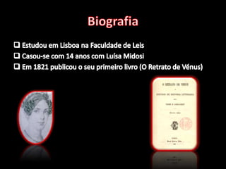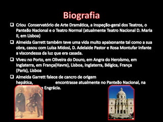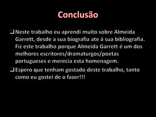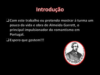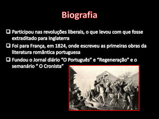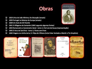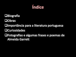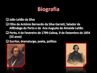 Almeida Garrett é considerado um dos autores mais geniais da literatura portuguesa dos séculos XIX e XX. Ele ocupa um lugar importante na história literária de Portugal. Almeida Garrett viveu em mais de 20 locais diferentes e mudou seu nome várias vezes ao longo da vida. Ele também ocupou vários cargos políticos.