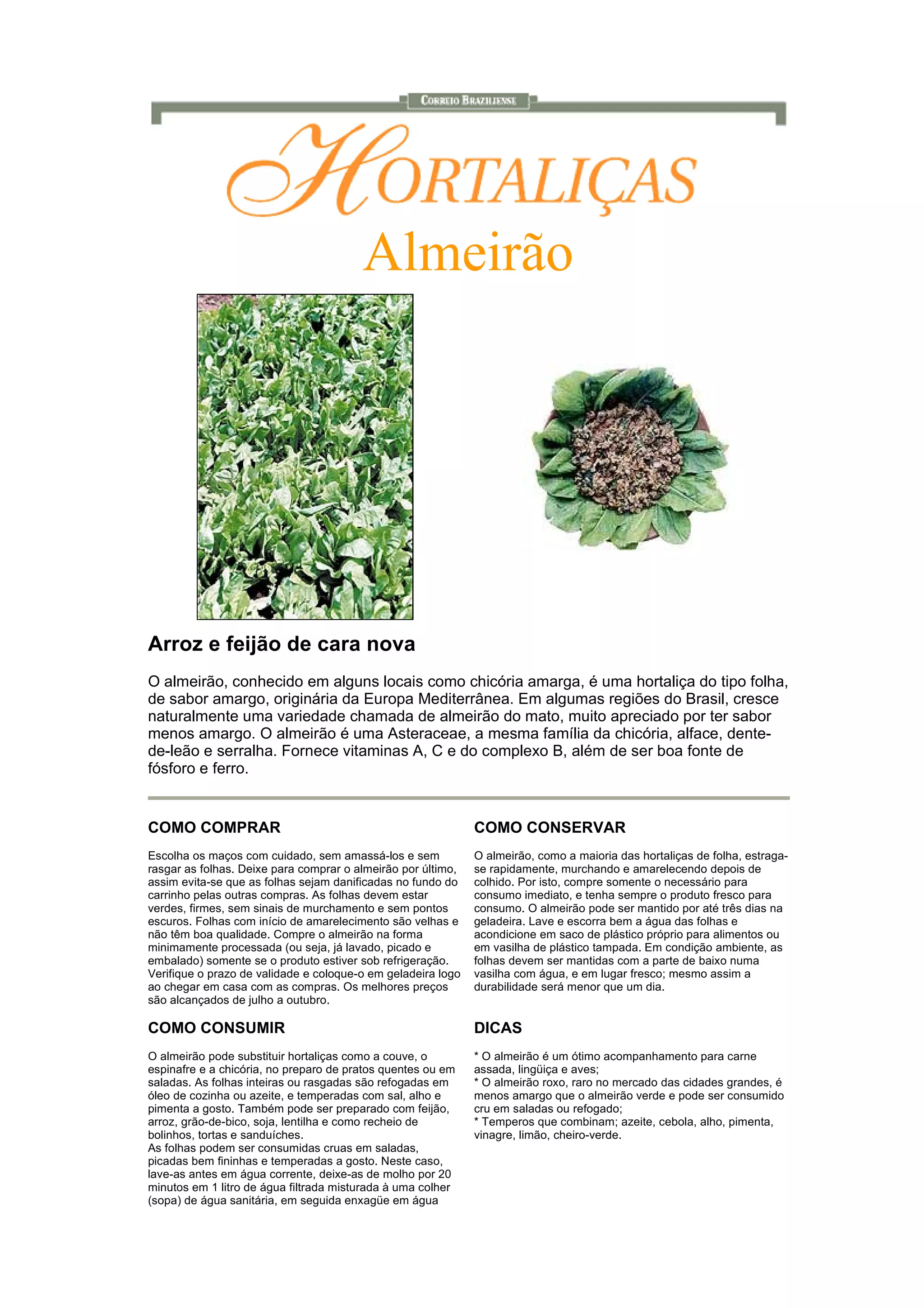 O almeirão é uma hortaliça folhosa originária da Europa com sabor amargo, rica em vitaminas e minerais. Deve ser comprado com as folhas verdes e firmes e consumido cozido ou cru em saladas. Pode ser preparado de diversas formas como refogado com feijão ou em bolinhos com batata.