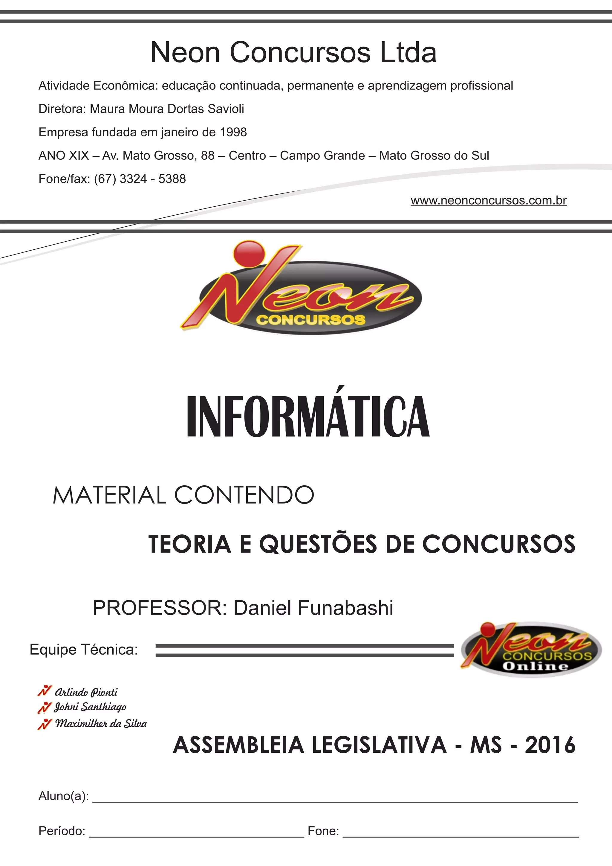 O documento apresenta informações sobre um curso de capacitação em informática ministrado pela empresa Neon Concursos Ltda, incluindo a equipe técnica responsável e os tópicos abordados no material, como conceitos básicos em informática, sistemas operacionais e pacotes office.