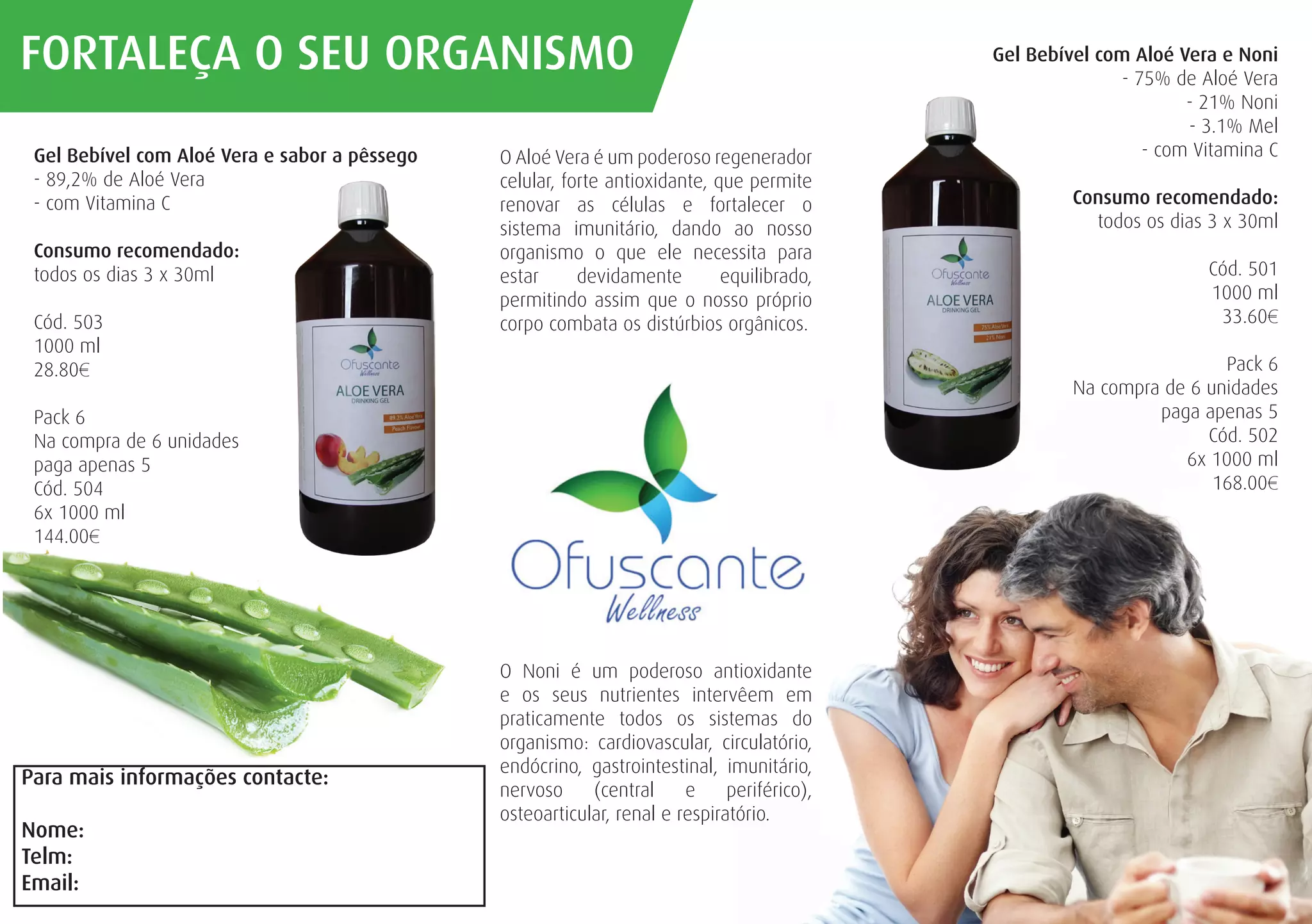 O documento descreve dois produtos à base de Aloé Vera e Noni para fortalecimento do organismo. O primeiro produto contém 75% de Aloé Vera e 21% de Noni e deve ser consumido 3 vezes por dia em porções de 30ml. O segundo produto contém 89,2% de Aloé Vera e Vitamina C e também deve ser consumido 3 vezes por dia em porções de 30ml. Ambos os produtos ajudam a renovar as células, fortalecer o sistema imunológico e combater distúrbios orgânicos.