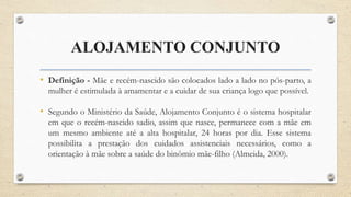 O documento discute o alojamento conjunto no pós-parto, que permite que a mãe e o recém-nascido fiquem juntos após o nascimento. Isso favorece a amamentação, o vínculo entre mãe e bebê e reduz infecções. Detalha também os objetivos, vantagens, população atendida, recursos e papel da enfermagem nesse modelo.