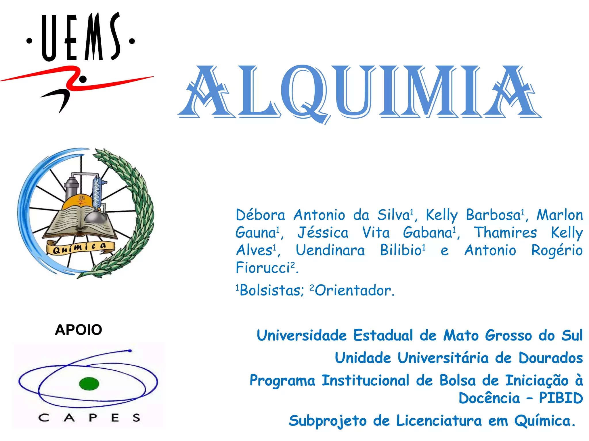 O documento apresenta um resumo sobre alquimia, abordando seu objetivo de transmutar metais em ouro através da pedra filosofal, sua relação com a filosofia e simbologia, alquimistas importantes como Roger Bacon e Nicolas Flamel, vidrarias e aparatos utilizados, elementos e substâncias estudadas, e como a alquimia contribuiu para o desenvolvimento da química moderna.