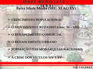 1. O documento descreve a Idade Média entre os séculos V-XV, período marcado pela formação e apogeu do feudalismo na Alta Idade Média e pela decadência do sistema feudal e surgimento do capitalismo na Baixa Idade Média.