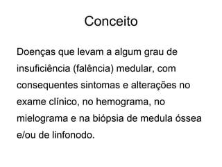O documento discute alterações hematológicas primárias, incluindo aplasia da medula óssea, leucemias, linfomas e outras doenças mieloproliferativas. Ele fornece detalhes sobre sintomas, causas, diagnóstico e tratamento dessas condições, bem como imagens ilustrativas.