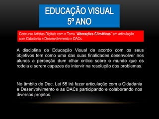 O documento descreve um projeto educativo sobre alterações climáticas para alunos do 2o ciclo do ensino básico. Os alunos irão criar desenhos sobre este tema para um livro de artista e para o concurso Artistas Digitais. O projeto tem como objetivos ensinar sobre as causas e impactos das alterações climáticas e promover comportamentos de adaptação e mitigação.