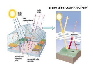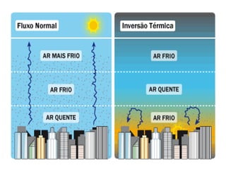 O documento discute os efeitos das alterações climáticas causadas pela poluição atmosférica em grandes cidades. Ele descreve como a poluição elevada pode elevar a temperatura e causar ilhas de calor urbanas, levando a uma invasão do mar no continente. Além disso, explica como a inversão térmica concentra poluentes perto da superfície do solo, especialmente no inverno, piorando problemas respiratórios.