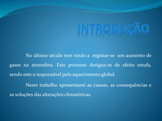 O documento discute as causas, consequências e soluções das alterações climáticas. As principais causas incluem o aumento de gases de efeito estufa na atmosfera e o excessivo consumo de recursos naturais. As consequências são variações climáticas extremas, aumento do nível do mar, desertificação e extinção em massa de espécies. Soluções como reduzir emissões, consumo de recursos e uso de transportes públicos podem ajudar a mitigar os impactos das alterações climáticas.