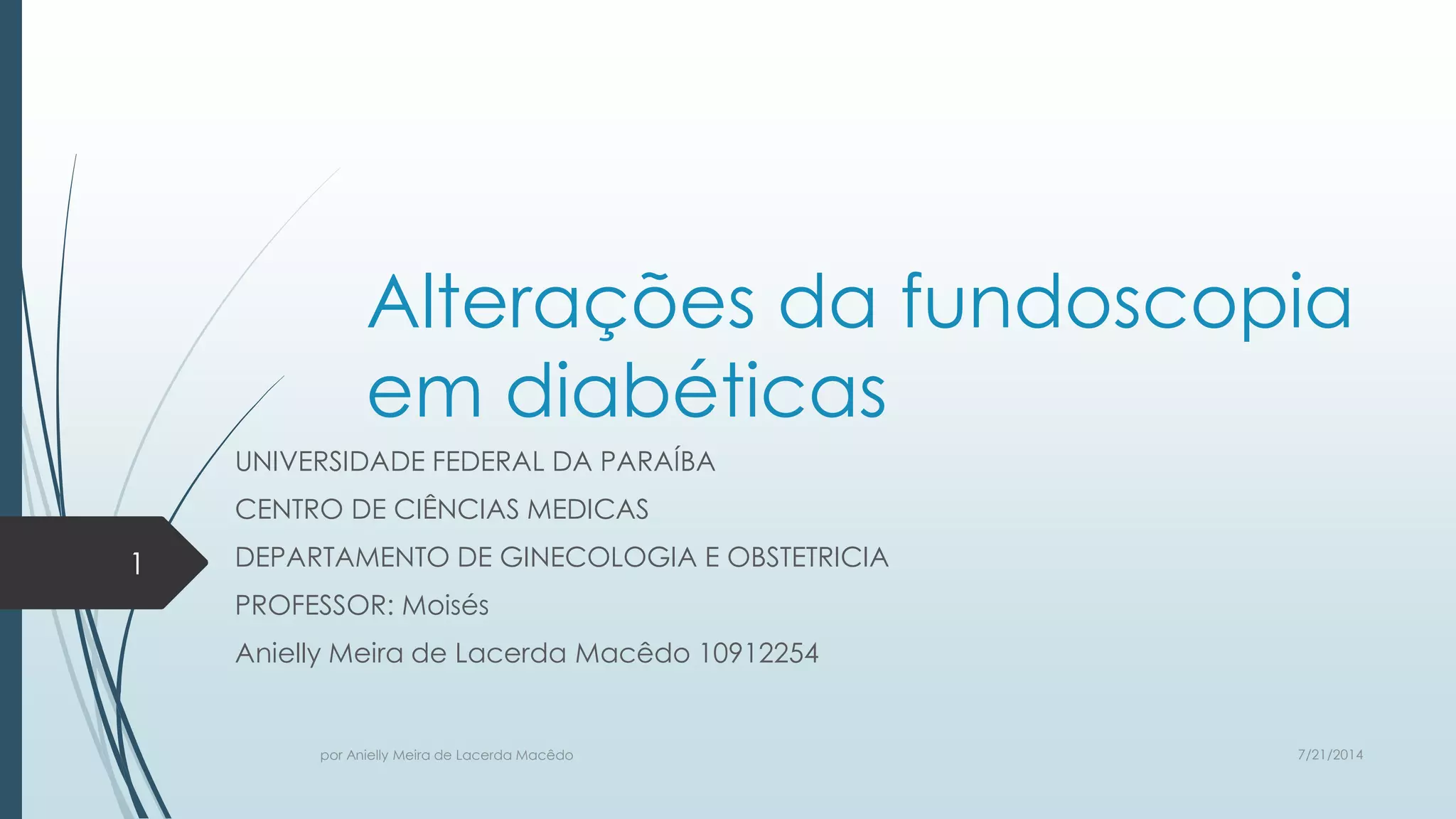 O documento discute as alterações da fundoscopia em pacientes diabéticas, descrevendo a fisiopatologia, classificação, sinais e sintomas da retinopatia diabética. Apresenta as complicações possíveis e as opções de tratamento, enfatizando a importância do diagnóstico precoce para prevenir a perda visual.