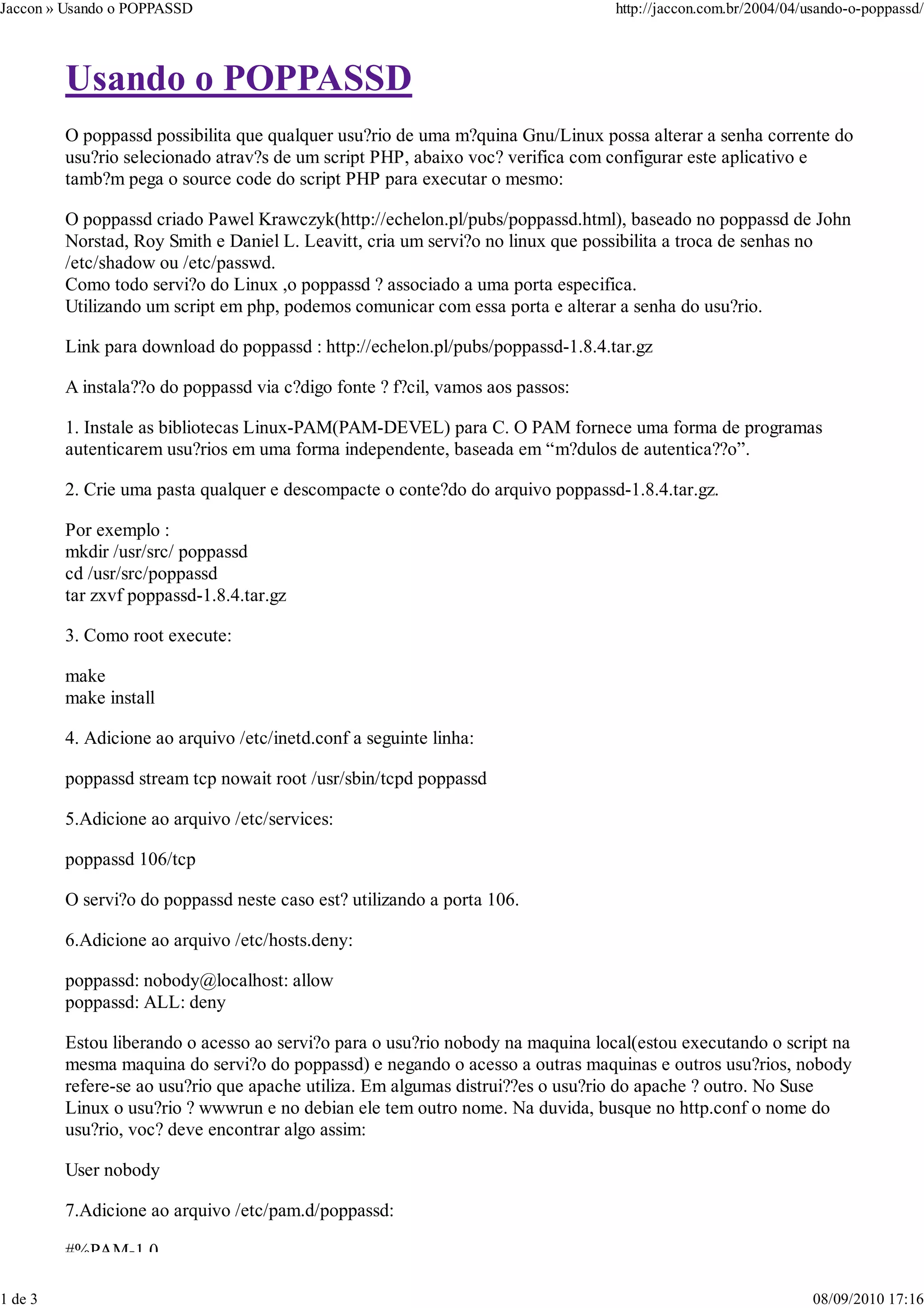 O documento explica como configurar e usar o POPPASSD, um serviço Linux que permite trocar senhas de usuários através de um script PHP. Ele descreve os passos para instalar o POPPASSD, configurar os arquivos necessários e fornece um exemplo de script PHP para realizar a troca de senha.