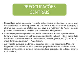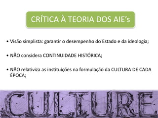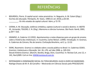 O documento discute a teoria do capital cultural de Pierre Bourdieu, incluindo seus três estados - incorporado, objetivado e institucionalizado. Também aborda como o capital social se refere às relações sociais que permitem a ação coletiva. Finalmente, menciona a noção de violência simbólica quando uma cultura é imposta como superior.