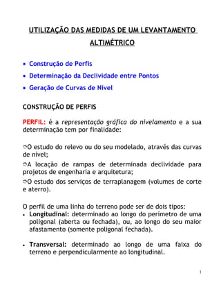 O documento discute as medidas de um levantamento altimétrico e como elas podem ser usadas para: 1) construir perfis longitudinais e transversais do terreno; 2) determinar a declividade entre pontos; e 3) gerar curvas de nível.