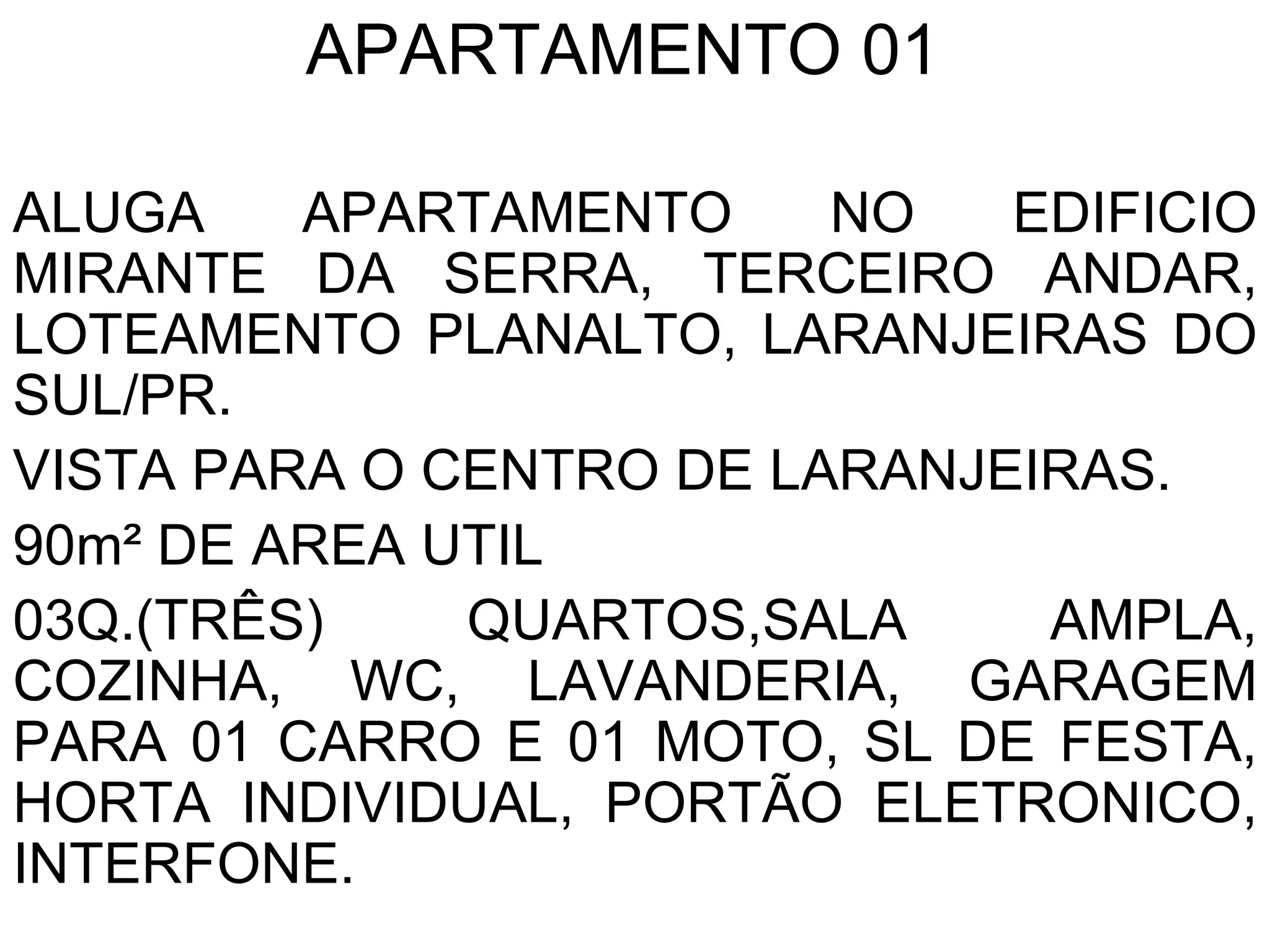 Um apartamento de 90m2 no terceiro andar do Edifício Mirante da Serra no Loteamento Planalto em Laranjeiras do Sul/PR está disponível para alugar. O apartamento tem três quartos, sala ampla, cozinha, banheiro, lavanderia, garagem para um carro e uma moto, área de festas, horta individual e portão e interfone eletrônicos.