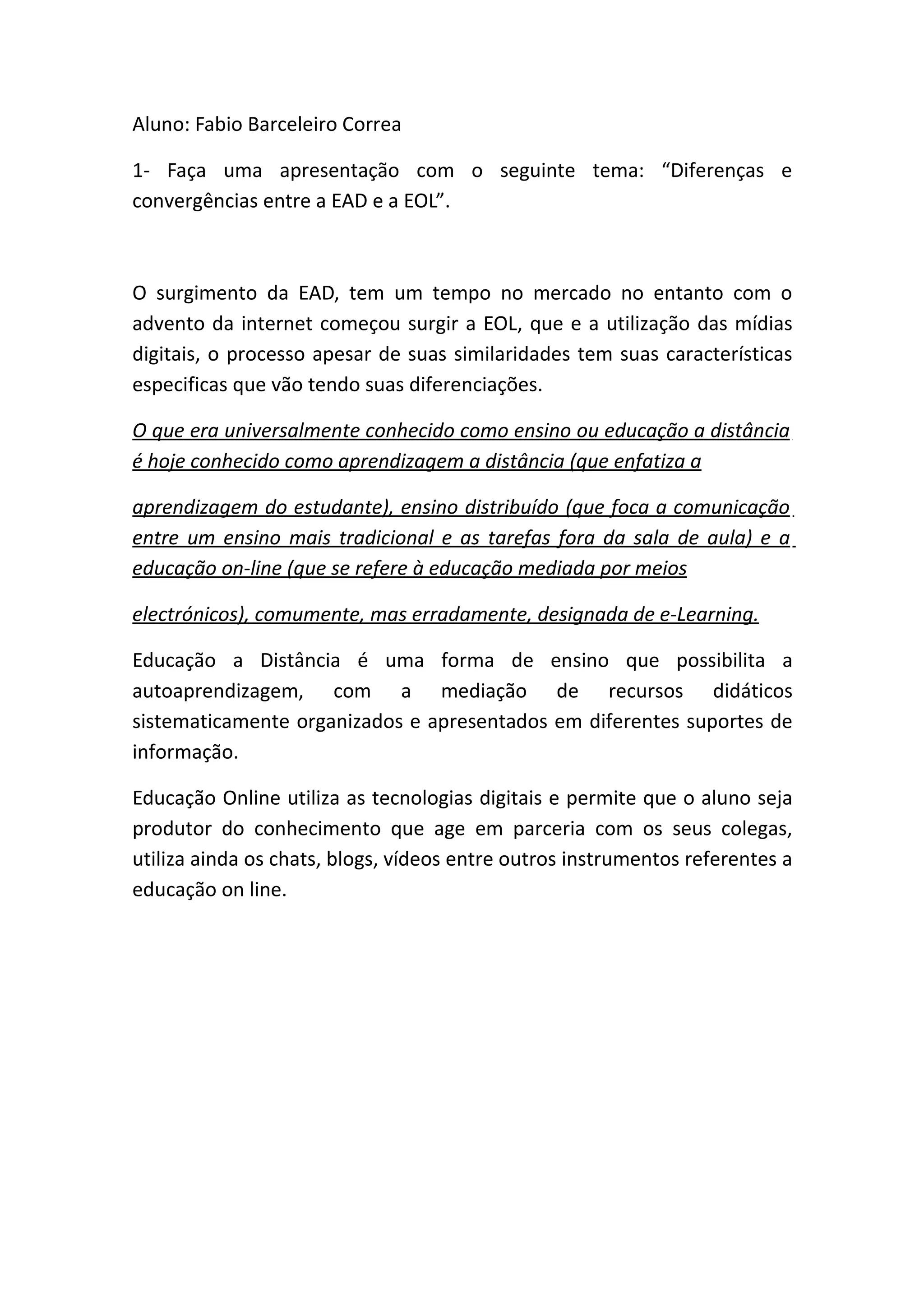 A apresentação comparará as diferenças e convergências entre Educação a Distância (EAD) e Educação Online (EOL). Embora similares, EAD enfatiza autoaprendizagem com recursos didáticos organizados, enquanto EOL usa tecnologias digitais para tornar os alunos produtores de conhecimento em parceria com colegas por meio de chats, blogs e vídeos.