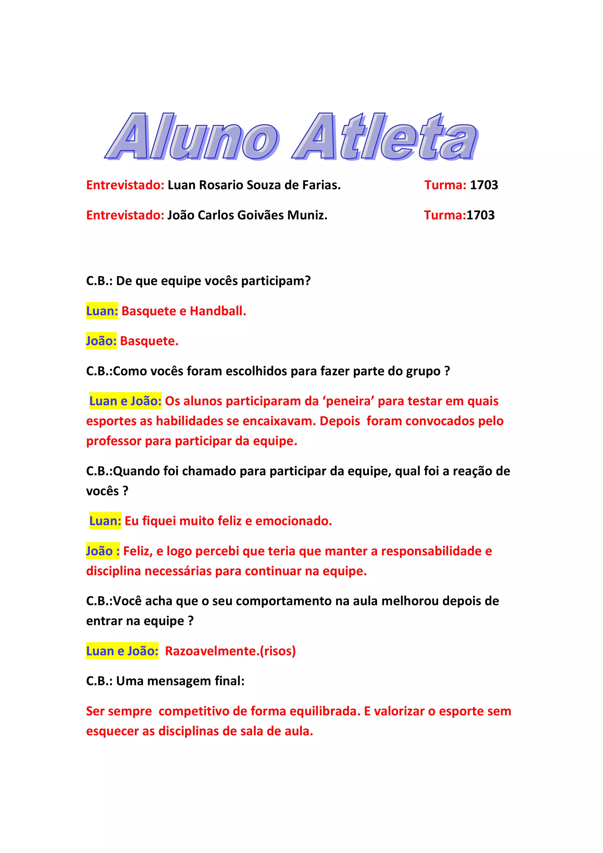 Dois alunos da turma 1703, Luan e João, participam das equipes de basquete e handball da escola. Eles foram selecionados após testes de habilidades esportivas ("peneira") e convocados pelos professores. Ao serem chamados, Luan ficou emocionado e feliz, enquanto João percebeu a necessidade de disciplina para continuar. Embora tenham melhorado razoavelmente o comportamento após entrarem para a equipe, os alunos devem manter o equilíbrio entre esporte e discipl