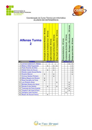 Este documento lista os alunos matriculados em três turmas de um curso técnico em informática, mostrando quais módulos cada aluno já concluiu ou está cursando atualmente. Dividido em três frases ou menos: O documento apresenta a distribuição de alunos em três turmas de um curso técnico em informática, indicando os módulos já concluídos e atualmente cursados por cada aluno.