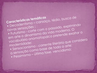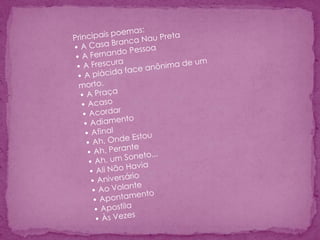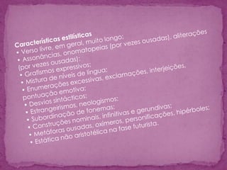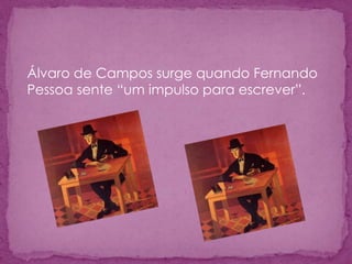 Álvaro de Campos é um heterônimo criado por Fernando Pessoa para expressar sentimentos sensacionais. Campos celebra a modernidade, a civilização industrial e a velocidade da vida urbana em poemas futuristas de estilo amplo e delirante. Ele procura experimentar todas as sensações do mundo moderno.