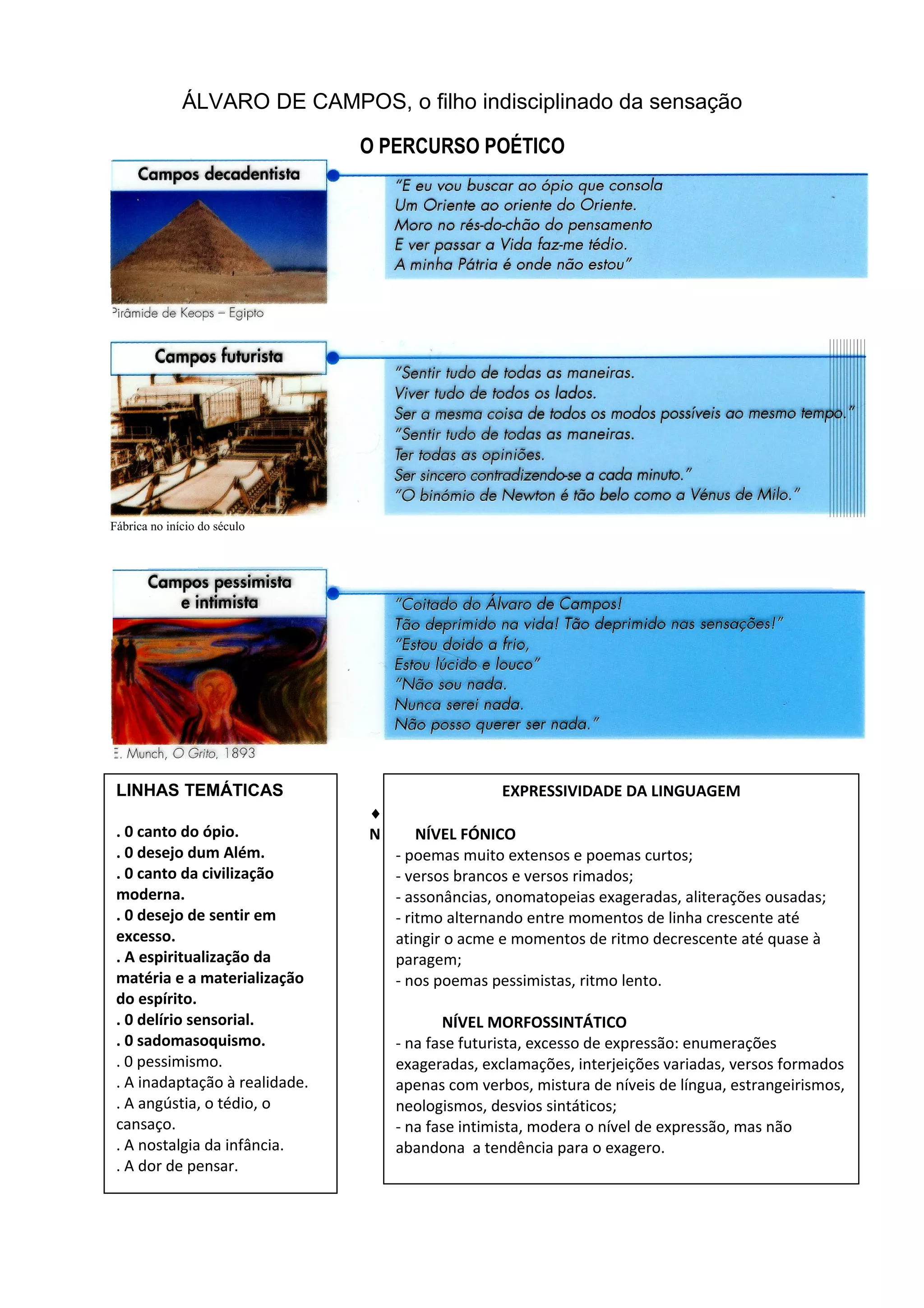 Álvaro de Campos foi um poeta português do início do século XX conhecido por sua poesia sensorial e pessimista. Seus poemas variavam em comprimento e estrutura métrica, com uso de assonâncias, aliterações e ritmos que alternavam entre aceleração e desaceleração. Sua linguagem evoluiu de uma fase futurista caracterizada por excesso de expressão para uma fase mais intimista e moderada.