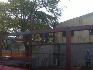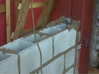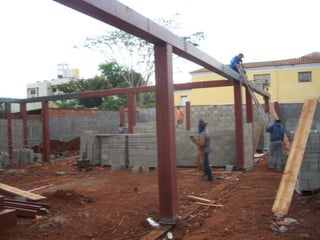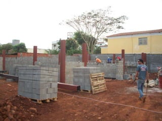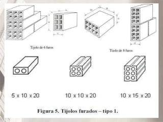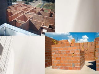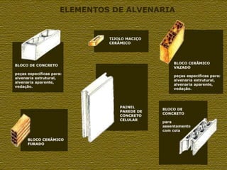 O documento apresenta conceitos básicos sobre alvenaria, incluindo definição, tipos de materiais usados e classificação de paredes. Também descreve técnicas construtivas como assentamento, encunhamento e cuidados, além de abordar alvenaria estrutural e possíveis patologias.