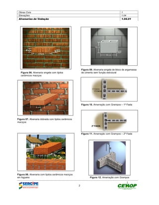 Este documento fornece informações técnicas sobre alvenarias de vedação, incluindo diferentes tipos de alvenarias, terminologia, projetos auxiliares, padronização estrutural e arquitetônica, e o uso de pré-moldados em concreto e argamassa armada, como vergas e contra-vergas. O documento contém 27 figuras ilustrativas dos diferentes tipos de alvenarias e detalhes construtivos.
