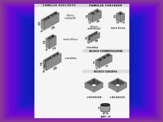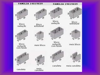 O documento descreve os principais tipos e funções de alvenarias de bloco. Apresenta informações sobre dimensionamento, classificação, tipos de paredes, amarração e outros aspectos técnicos das alvenarias.