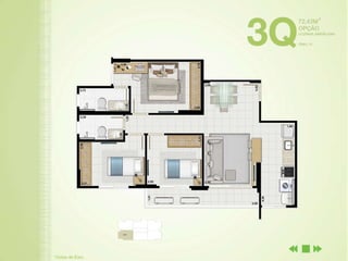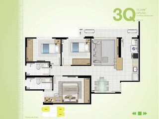 O documento descreve as características de um empreendimento imobiliário residencial localizado em Cuiabá, Mato Grosso, incluindo sua localização, unidades, áreas comuns e de lazer. O empreendimento consiste em três torres com 25 andares cada uma, contendo um total de 450 apartamentos de 2 e 3 quartos, além de amplas áreas comuns internas e externas como piscinas, quadra, playground e salão de festas.